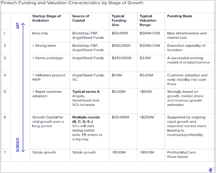 An example in the Fintech funding and valuation characteristics by stage of growth is noted below: